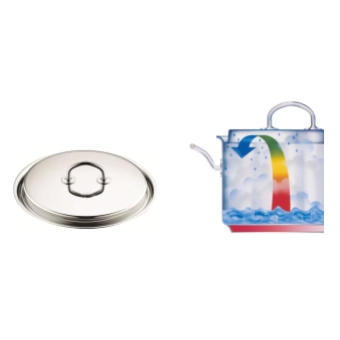 Der schwere Hochraum-Aromadeckel hat die gleiche Rundung wie der Schüttrand – schließt daher perfekt dicht ab und ermöglicht fettfreies, wasserarmes Garen im eigenen Saft. Der Dampf zirkuliert im Topf und fällt auf das Kochgut zurück.