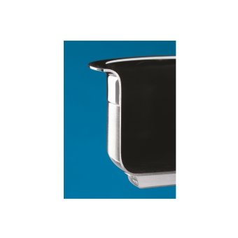 Die Seitenwände sind aus Edelstahl, damit die Hitze im Topf bleibt – was zusammen mit dem dicken Boden das Konstant-Halten der Temperatur beim Dünsten und Schmoren enorm erleichtert. Die Seiten sind oben verstärkt – ebenfalls ein Profi-Feature – und laufen zu einem feinen, tropffrei gießenden Schüttrand aus.